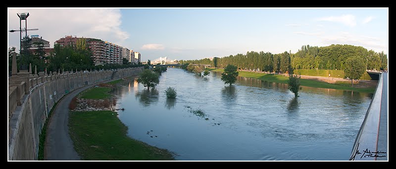 Quatre panoràmiques del riu Segre, al seu pas per Lleida el diumenge passat, amb una mica més d'aigua del que acostume a portar. Aquest any es la segona vegada que el Segre es surt de mare, per sort ha estat poca cosa.